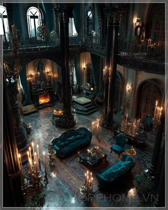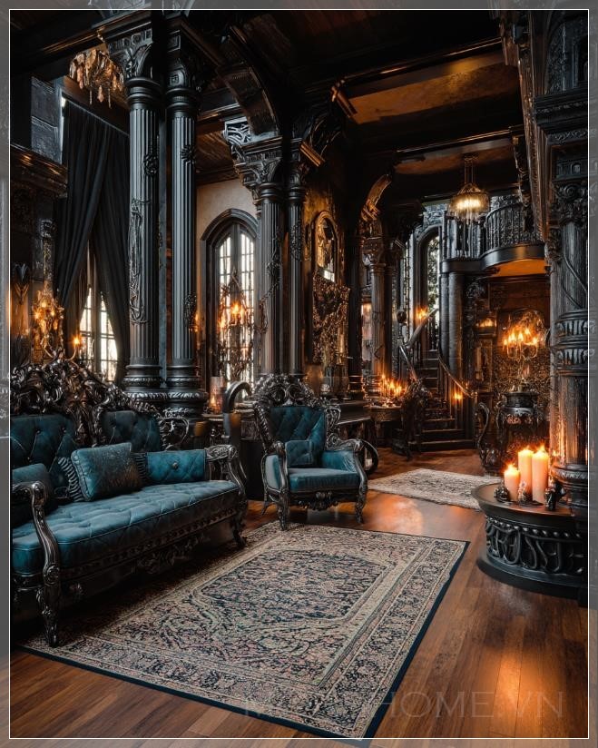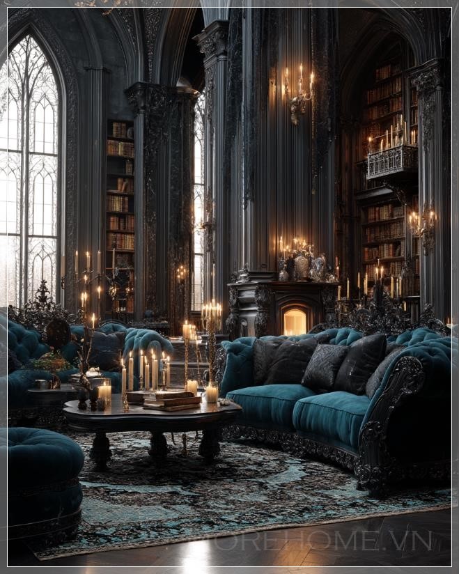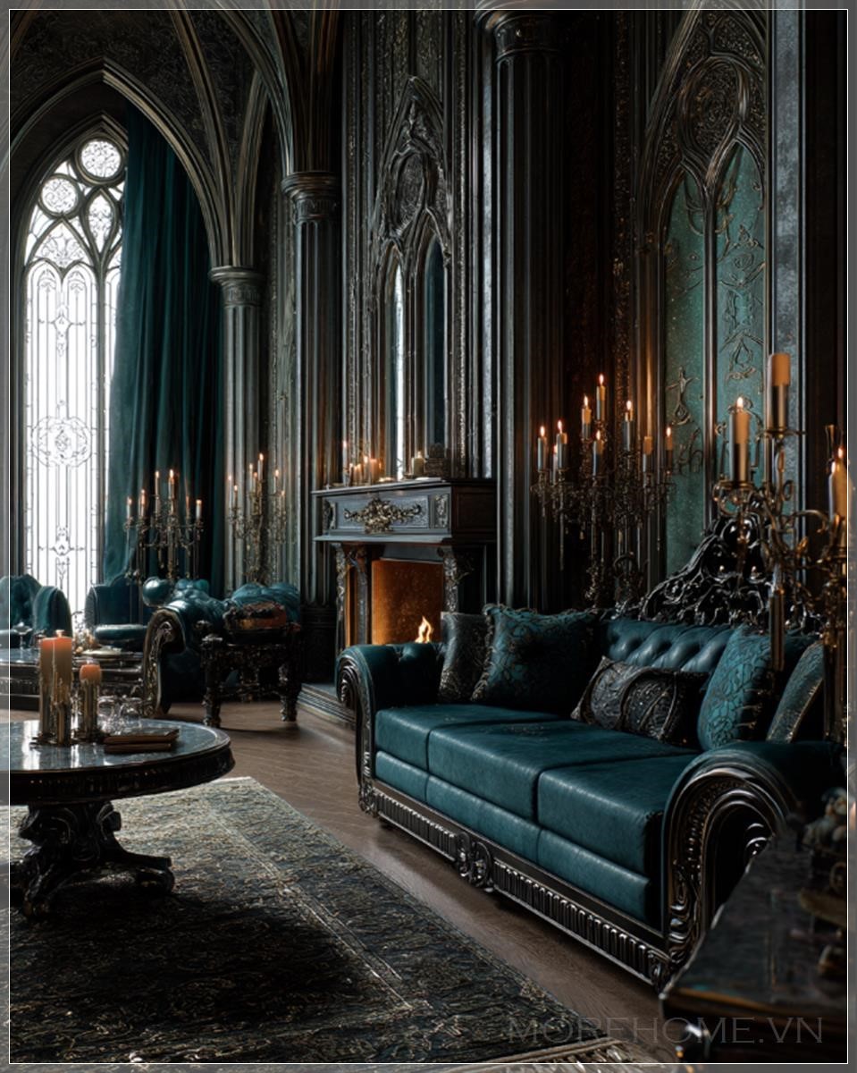 Ở trung tâm căn phòng là bộ ghế sofa Victorian Gothic với đường nét cong cong thanh lịch và bọc nhung đen. Những chiếc gối trang trí màu ngọc lam sâu thẳm tạo nên sự tương phản tinh tế với tông màu đen chủ đạo. Đối diện với sofa là lò sưởi bằng đá cẩm thạch đen, ngọn lửa nhảy múa tạo nên những cái bóng chuyển động trên sàn nhà.