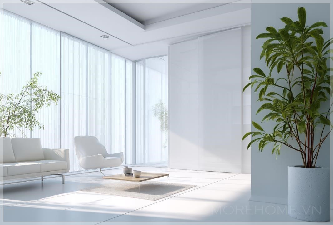 Điểm sinh động duy nhất trong không gian trắng tinh khôi này chính là sự hiện diện của cây xanh. Một chậu cây được đặt chiến lược không chỉ mang lại sự sống động cho không gian mà còn tạo ra sự cân bằng hoàn hảo giữa tự nhiên và hiện đại. Màu xanh tươi mát của lá cây tạo thành điểm nhấn tự nhiên, làm cho không gian trở nên ấm áp và có hồn hơn, không còn là sự lạnh lùng của màu trắng đơn thuần.