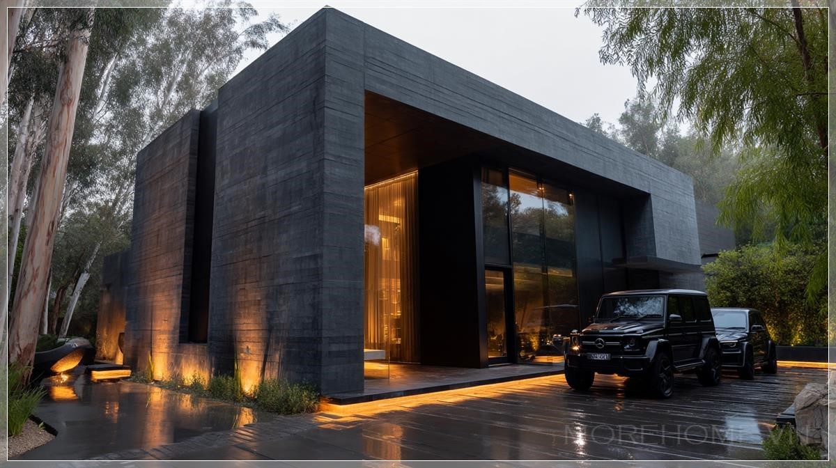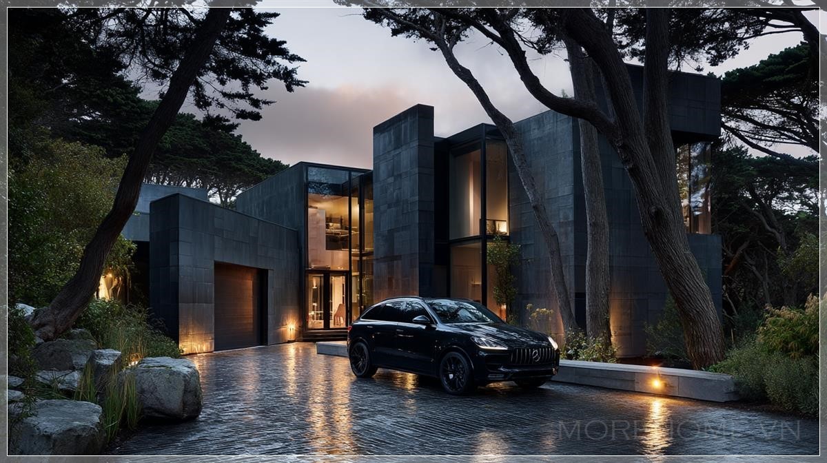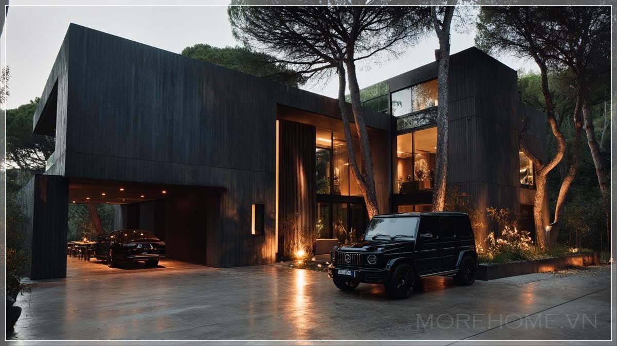 Những bức tường bê tông tối màu với kết cấu thô ráp tương phản hoàn hảo với những tấm kính lớn phản chiếu hình ảnh của những cây cổ thụ cao vút xung quanh. Ánh sáng vàng ấm áp từ bên trong ngôi nhà tỏa ra qua những ô cửa sổ, tạo nên một khung cảnh thơ mộng như trong những bộ phim điện ảnh đẳng cấp. Đó là sự kết hợp hoàn hảo giữa sự cứng cáp của kiến trúc hiện đại và sự mềm mại của ánh sáng tự nhiên.