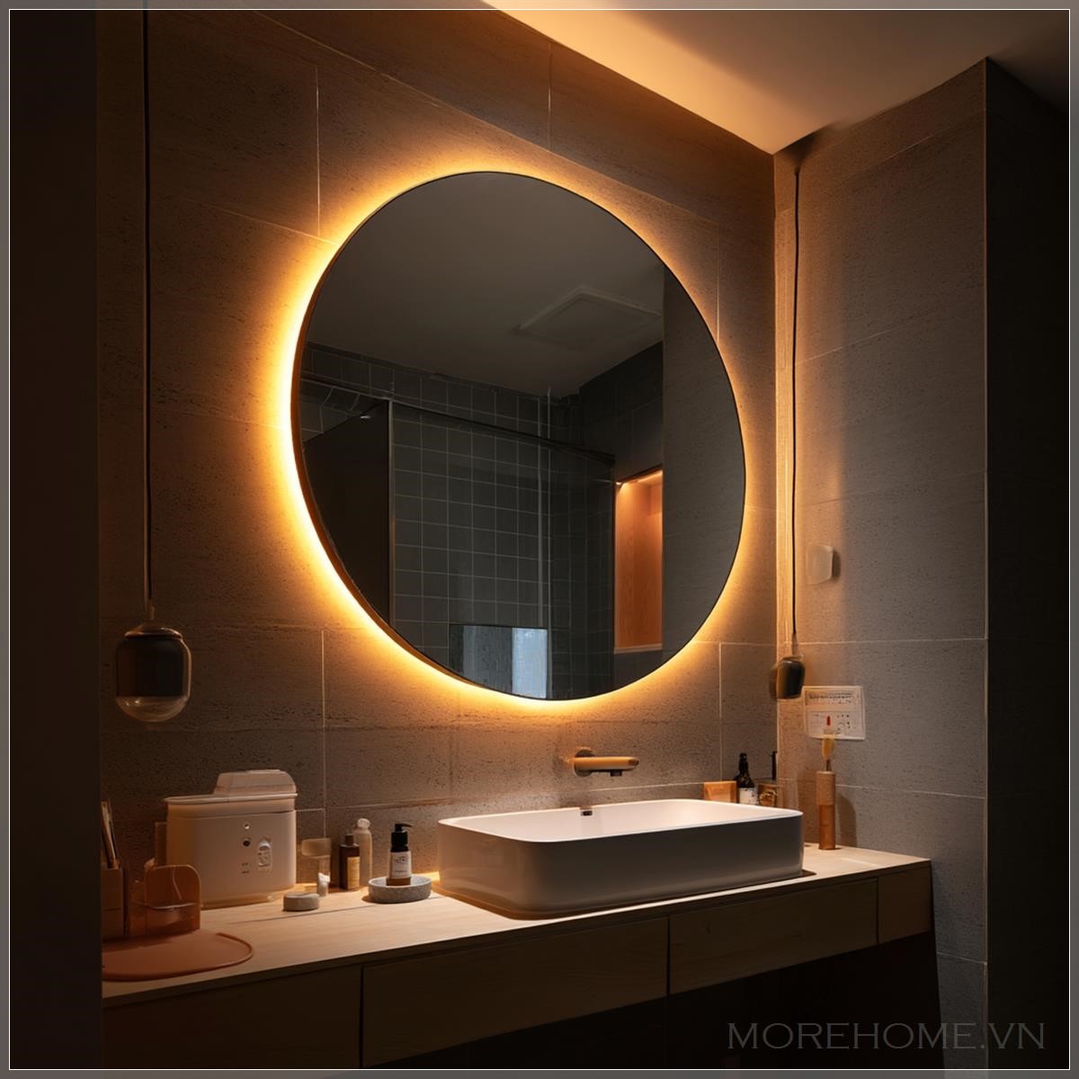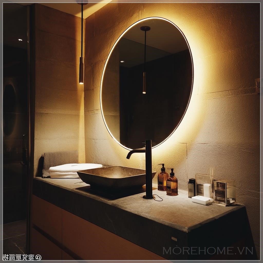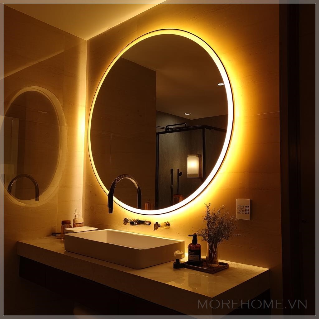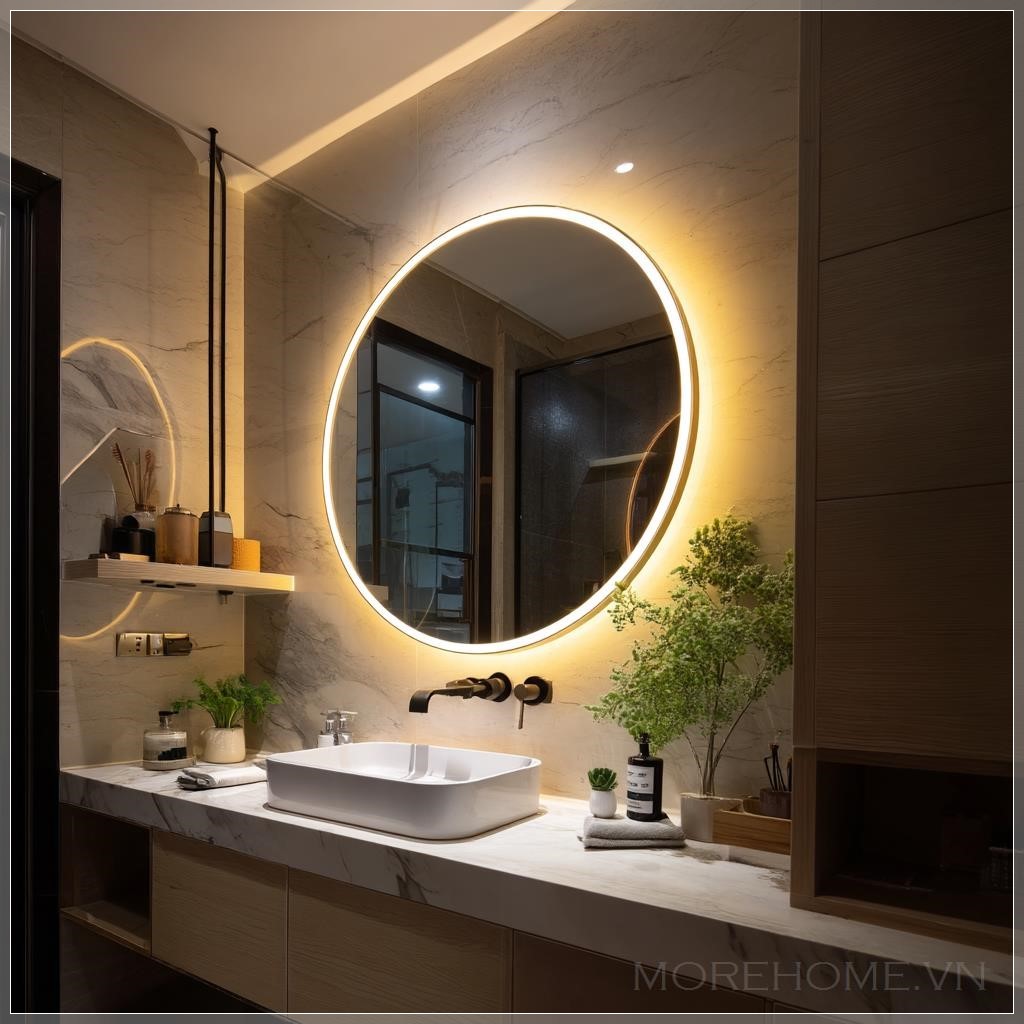 Không gian phòng tắm hiện đại ngày nay không chỉ đơn thuần là nơi thực hiện các hoạt động cá nhân, mà còn là nơi để thư giãn và tái tạo năng lượng. Trong đó, ánh sáng đóng vai trò quan trọng trong việc thiết lập cảm xúc và nâng cao trải nghiệm người dùng. Một thiết kế đặc biệt nổi bật là việc sử dụng dải đèn LED xung quanh gương tròn – một chi tiết tưởng nhỏ nhưng lại là điểm nhấn tinh tế và đầy tính thẩm mỹ cho toàn bộ căn phòng.