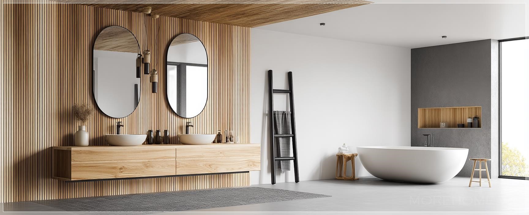 Thiết kế phòng tắm này được xây dựng trên nền tảng của phong cách Scandinavian – đơn giản, sạch sẽ và tinh tế. Bức tường trắng và các tấm gỗ sồi tạo nên một bức tranh tổng thể đầy tinh tế. Hai chiếc gương oval treo trên tường phía trên tủ lavabo bằng gỗ sồi cùng với một chiếc gương hình chữ nhật phía trước tạo điểm nhấn cho không gian. Những chi tiết như bậc thang đen cạnh bồn tắm độc lập và các vật liệu gỗ tự nhiên không chỉ giúp không gian trở nên ấm cúng mà còn giữ được vẻ đẹp tối giản đặc trưng của phong cách này.