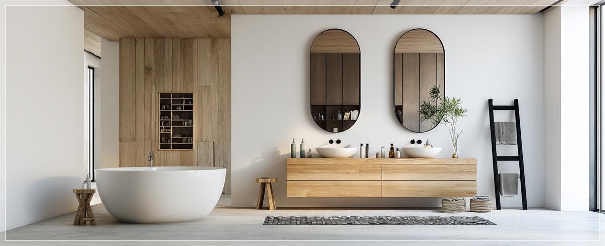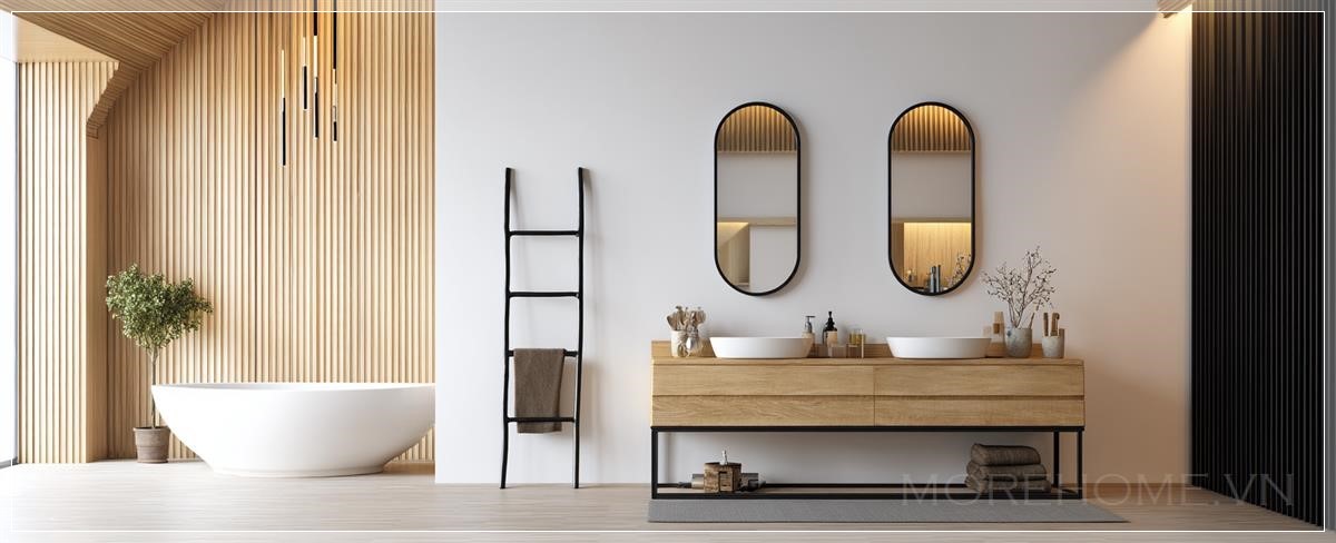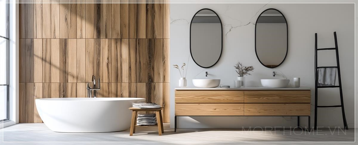 Với sự ứng dụng của các vật liệu tự nhiên, phòng tắm không chỉ là nơi để thư giãn mà còn thể hiện được sự kết hợp tinh tế giữa công năng và thẩm mỹ. Việc sử dụng các loại gỗ như gỗ sồi và đá không chỉ mang lại vẻ đẹp lâu dài mà còn dễ dàng bảo dưỡng và duy trì. Những chi tiết thiết kế thông minh như gương hình oval và chữ nhật không chỉ giúp tối ưu hóa không gian mà còn tạo điểm nhấn độc đáo cho không gian phòng tắm.