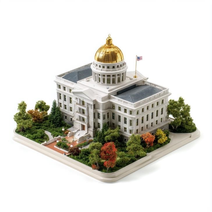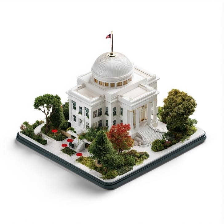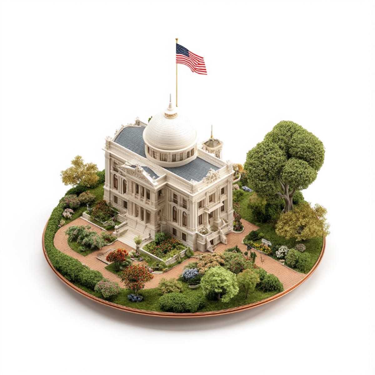 Với nền tảng là màu trắng tinh khiết, mô hình tòa nhà mang đến một cảm giác nhẹ nhàng, thanh thoát, và dễ dàng kết hợp với bất kỳ không gian nào. Phần mái vòm được thiết kế tỉ mỉ, tạo nên sự hoàn mỹ cho tổng thể công trình. Cột cờ cao vút không chỉ là yếu tố đặc trưng của một tòa nhà lập pháp, mà còn tạo điểm nhấn mạnh mẽ, thu hút sự chú ý ngay từ cái nhìn đầu tiên. Vị trí của khuôn viên xanh bao quanh tòa nhà càng làm nổi bật vẻ đẹp thanh lịch và sự gần gũi với thiên nhiên.
